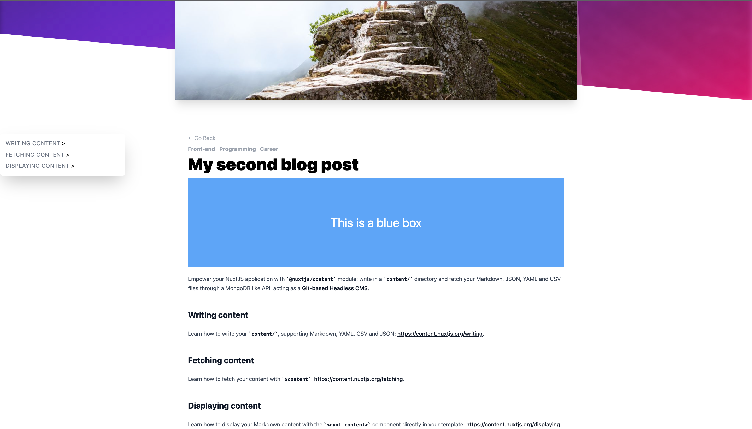 Firstly, we’re including the post image on top of the page to catch the attention of our reader. Then we add a Table of Content using a special key on our post object that Nuxt Content has added for us called toc. This key is an array with ID’s of every headline that’s part of the body content. We use this to add