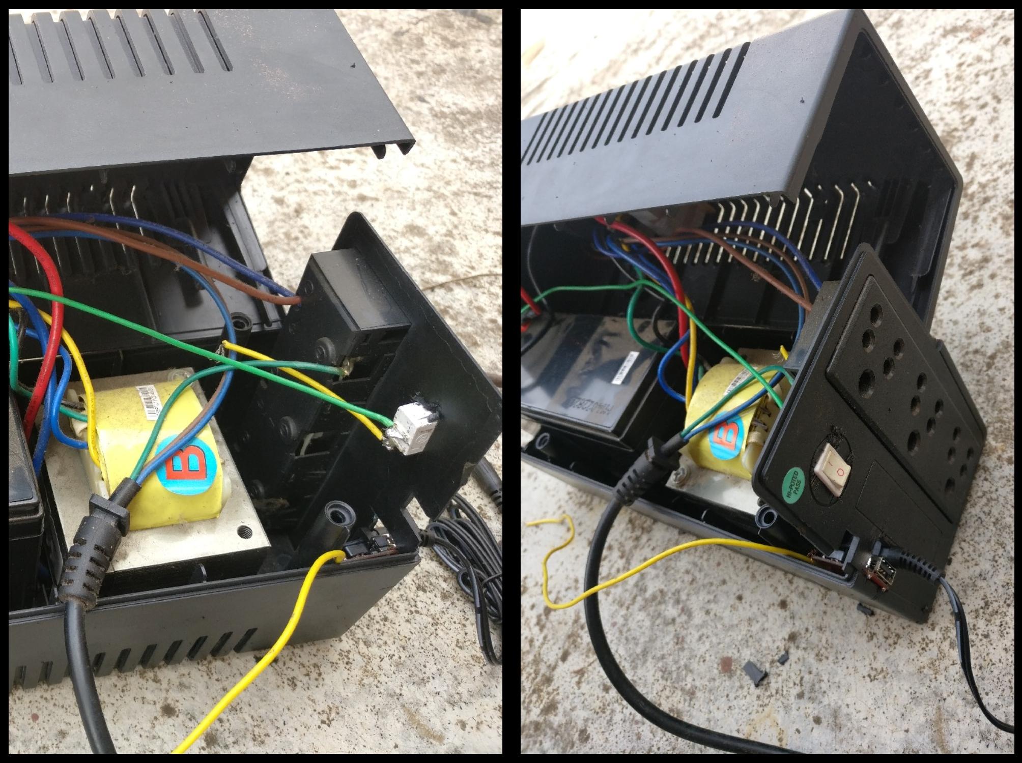 Hacked the UPS to provide a constant 5V supply to the Raspberry Pi and 12V to the LCD converter board to keep the Mirror running even when there is a power outage. The 5V conversion was done using a USB step-down voltage regulator module.