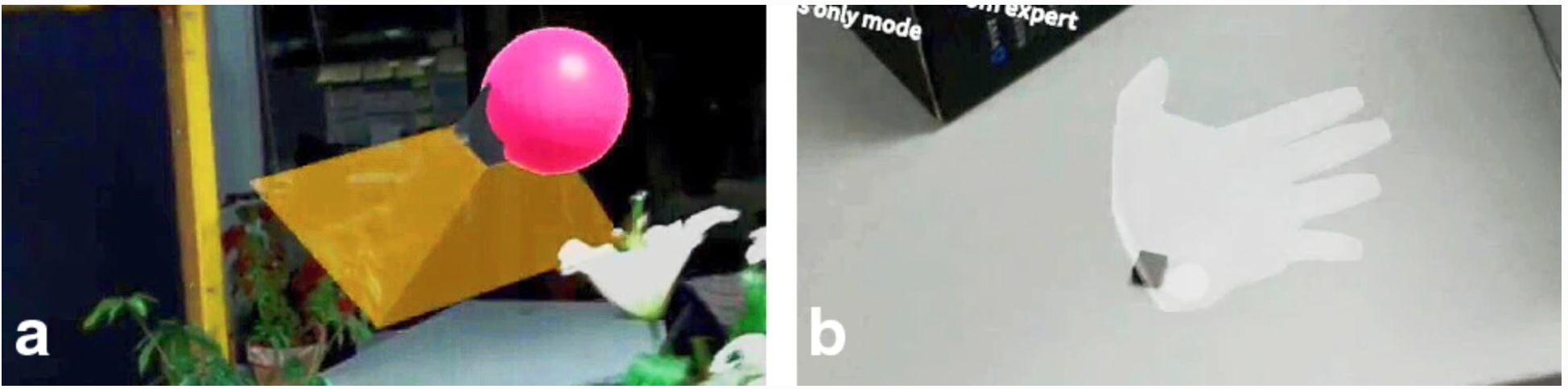 Figure: The illustrations of the head frustum (a) and hand gesture (b) shared from the remote to the local side