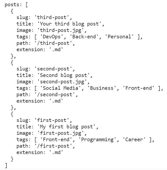 Now, copy paste this post in the same directory to create a couple more. Update their filename, title, image path and tags to something else to make them unique: