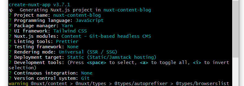 This will ask you a bunch of questions to help you setup the project. Feel free to pick any options you like, but for simplicity, this is what I went with: