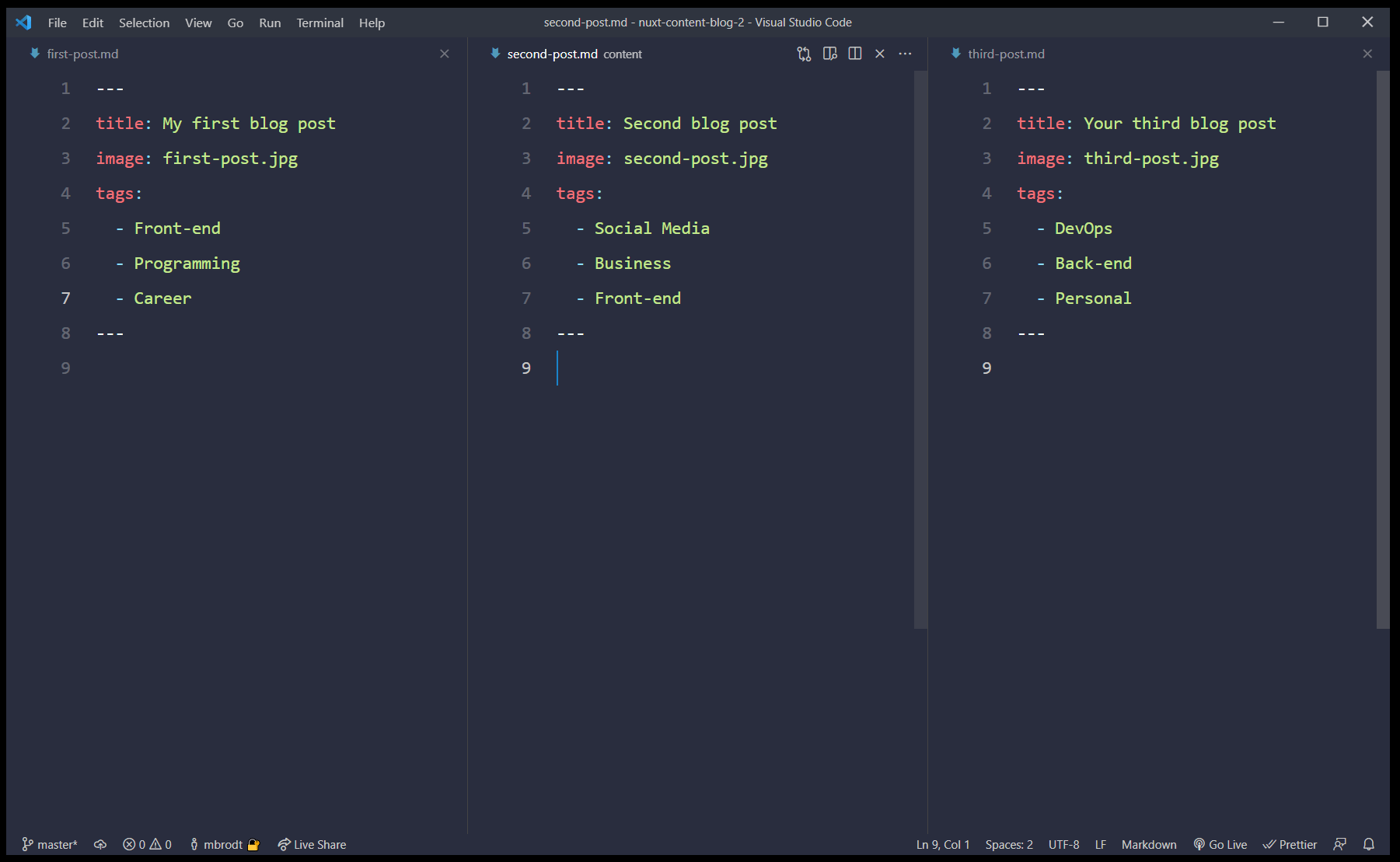 Now we’re ready to start building! Let’s start by adding a few more posts. We’ll use frontmatter (which comes automatically with Nuxt Content) to describe some basic data about each of our posts. If you open up hello.md, the frontmatter is the information between the dashes at the top: