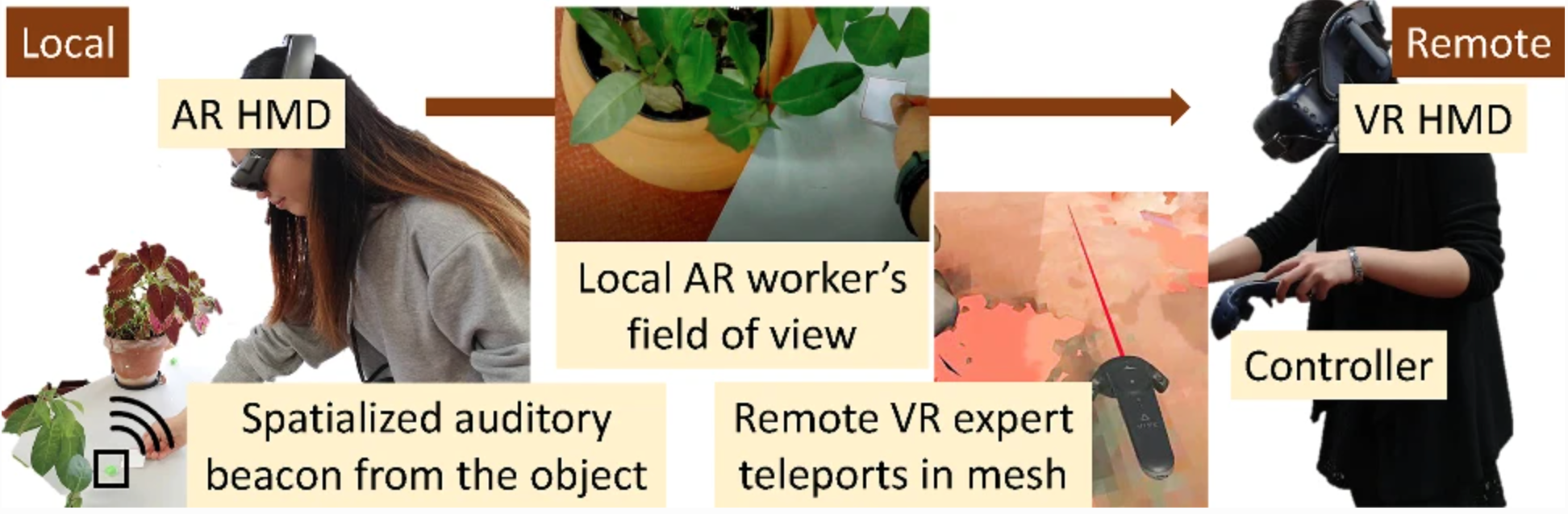 Figure: The overview of our MR remote collaboration system: the remote expert uses VR teleportation to virtually move in a 3D virtual replica of the local space. The expert also talks to the local worker and provides spatialized auditory beacons that are perceived via the local worker’s AR headset. When visual cues are enabled, the expert’s hand and head representations will be visible to the local worker. The local worker’s egocentric view is always live shared with the remote expert